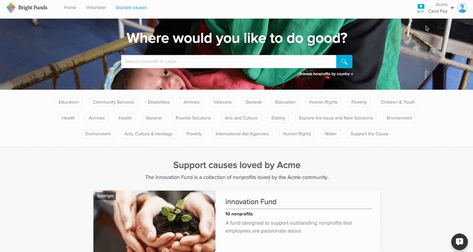 - Search for and select the nonprofit or Fund you would like to support.